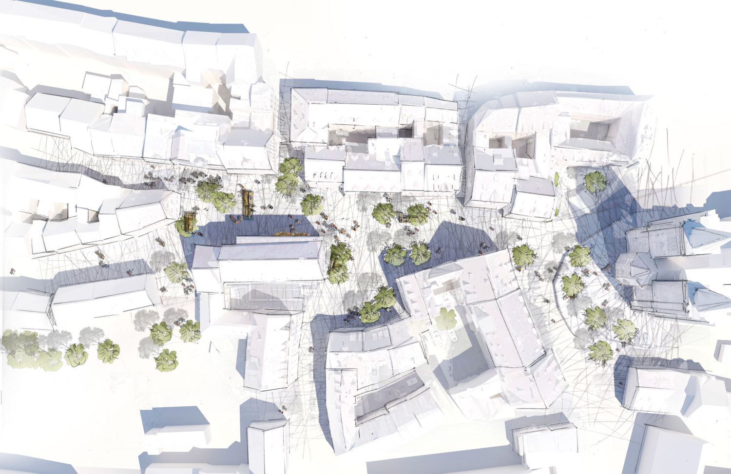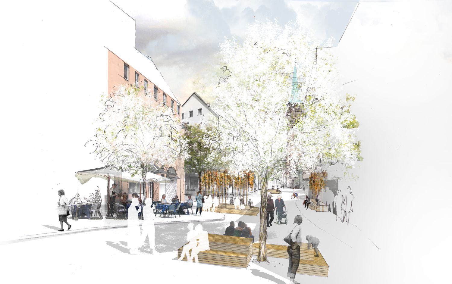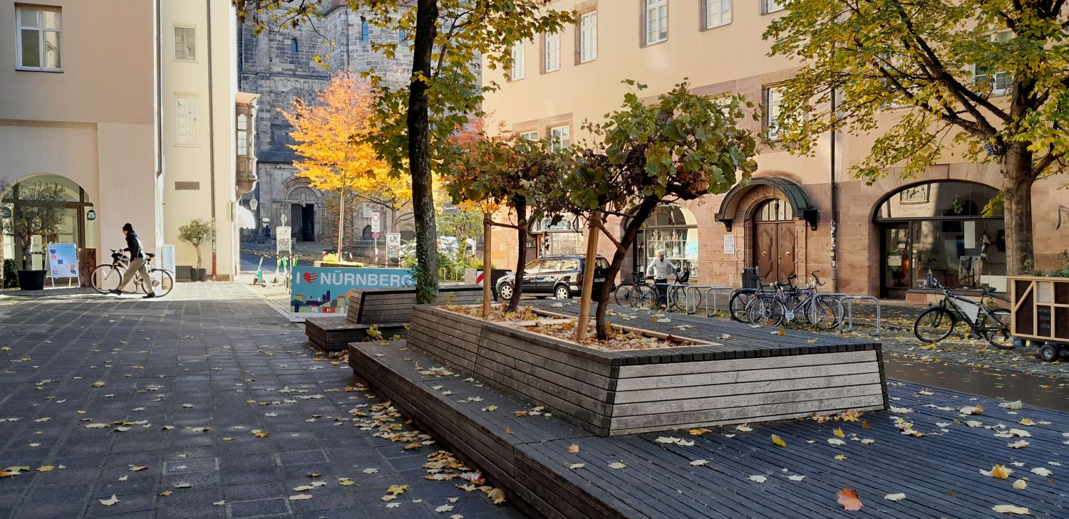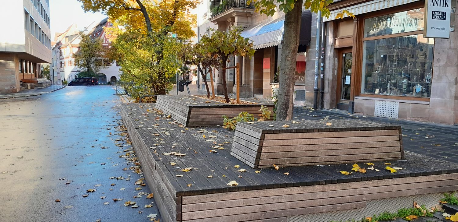 Gemeinsam mit Bürgerinnen wurde in mehreren Planungswerkstätten ein Konzept zur Nutzung des Weinmarktes, ein Platz in der nördlichen Altstadt Nürnbergs gelegen, als Fußgängerzone erarbeitet. Das Ergebnis sind fünf große Holzplattformen, die vom Architekturbüro LangHuggerRampp geplant und entworfen wurden. Die Darstellungen dazu hat das Büro die-grille erarbeitet.