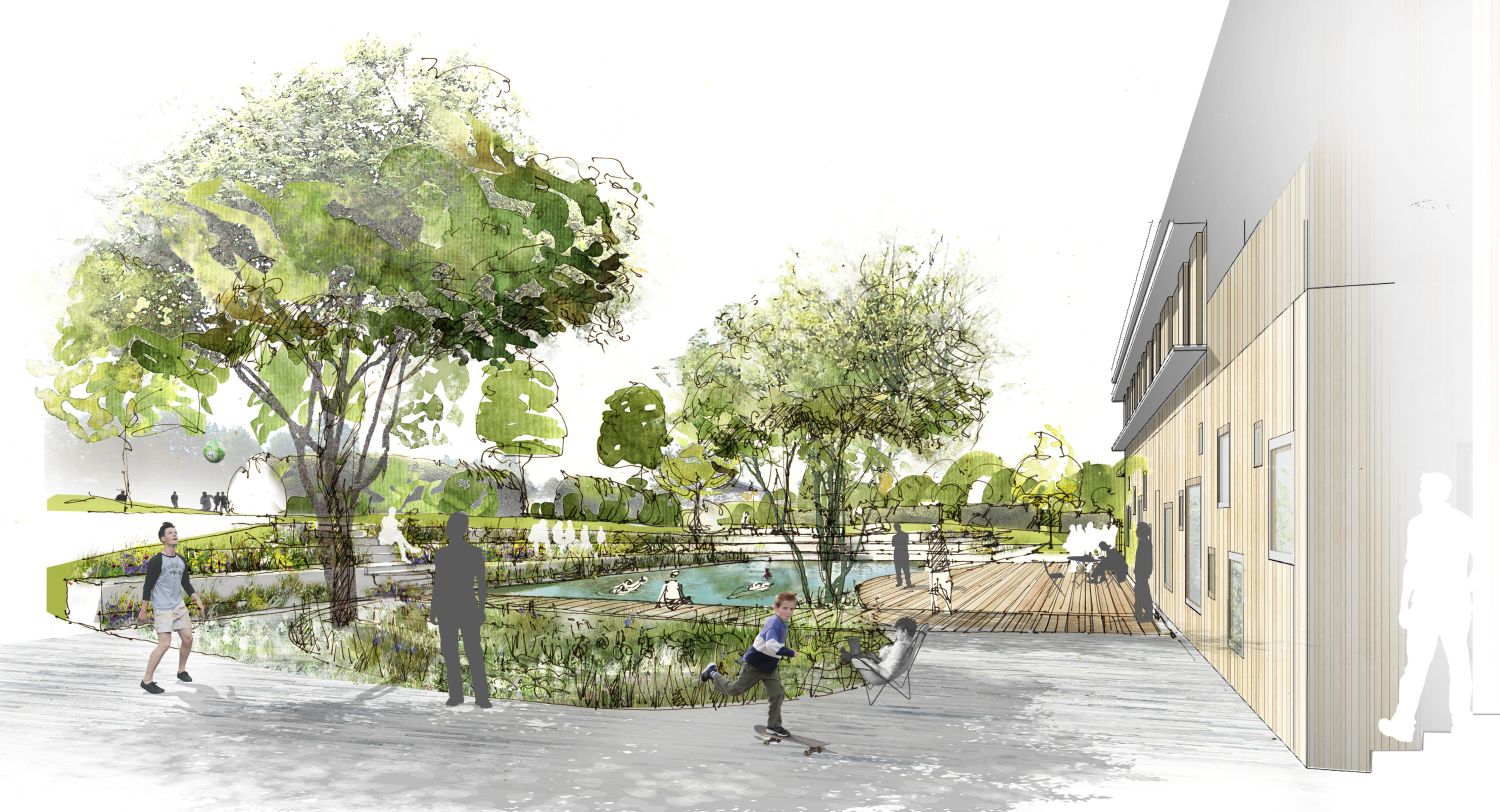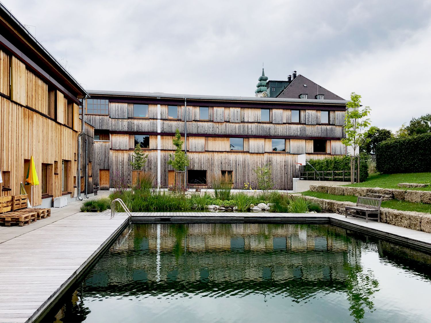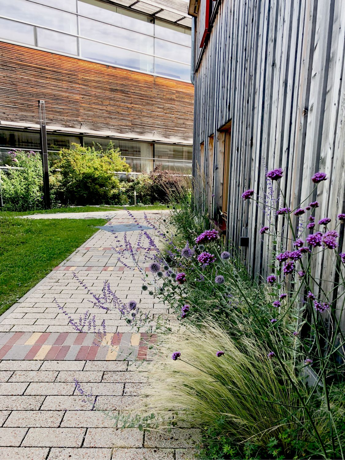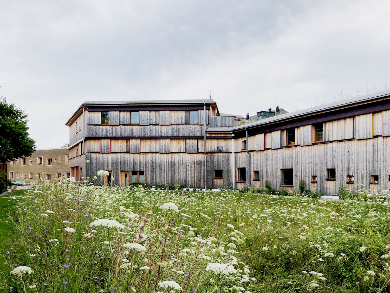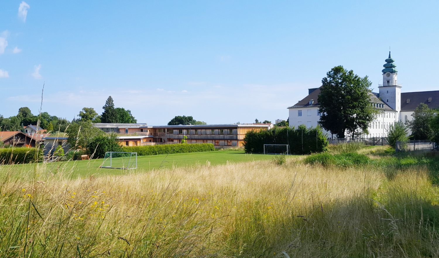 Das neue Internatsgebäude ist so positioniert, dass es sich nach Osten zum öffentlichen Platz des Campus abgrenzt und so nach Westen einen geschützten Raum entstehen lässt. Dieser Bereich dient am Campus St. Michael als privater Rückzugsort für die dort wohnenden Schüler. Hier befinden sich der Schwimmteich, ein Bolzplatz mit grünem Ballfangzaun, Volleyballplatz sowie eine multifunktionale Sportfläche aus Tartan. Eine große Retentionsmulde bildet den Übergang zwischen Internatsbereich und Schöpfungsgarten.