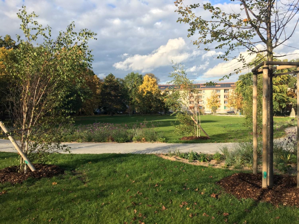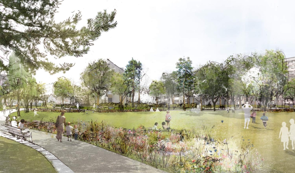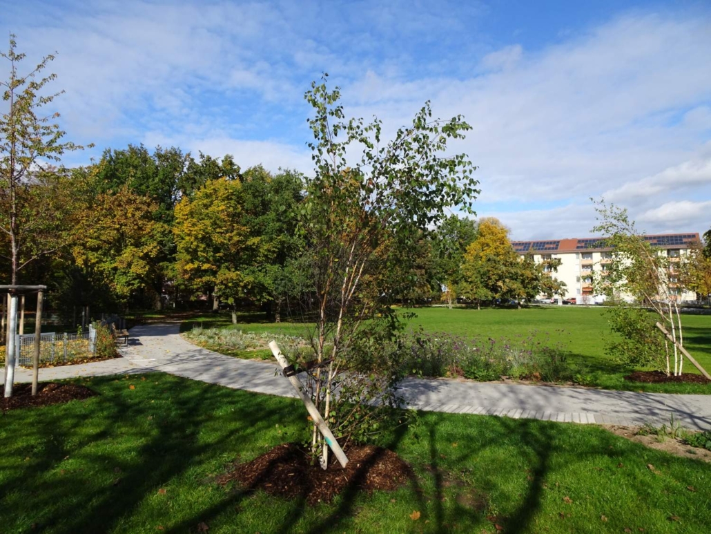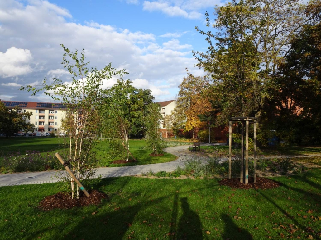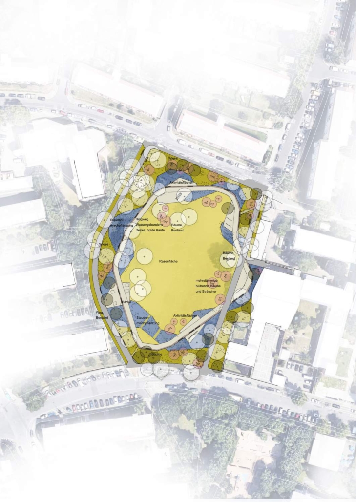 Die Neugestaltung behebt die offenkundigen Defizite der abgenutzten Parkfläche. Dem weitgehend intakten Baumbestand werden neue Vegetationsebenen hinzugefügt, die den Park als Innenraum erlebbar machen. Abstandsgrün und Gebüsche werden ausgelichtet, so dass die wahrnehmbaren Grenzen des Parkes sich weiten. Ein Ringweg umrahmt eine Rasenfläche als inszenierte freie Mitte, der von einem Blütenband begleitet wird und an den sich kleine Platzflächen mit generationsübergreifenden Spiel und Bewegungsgeräten anlagern.