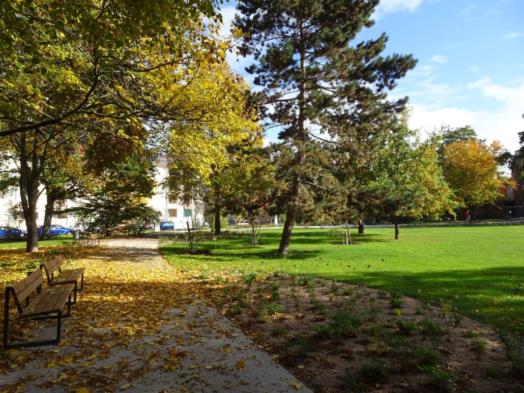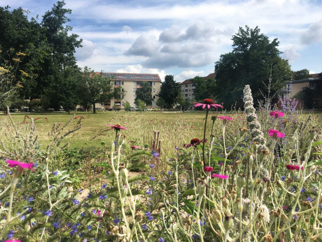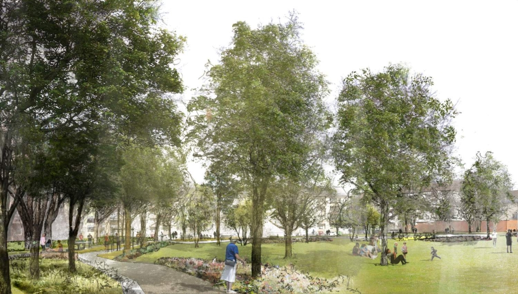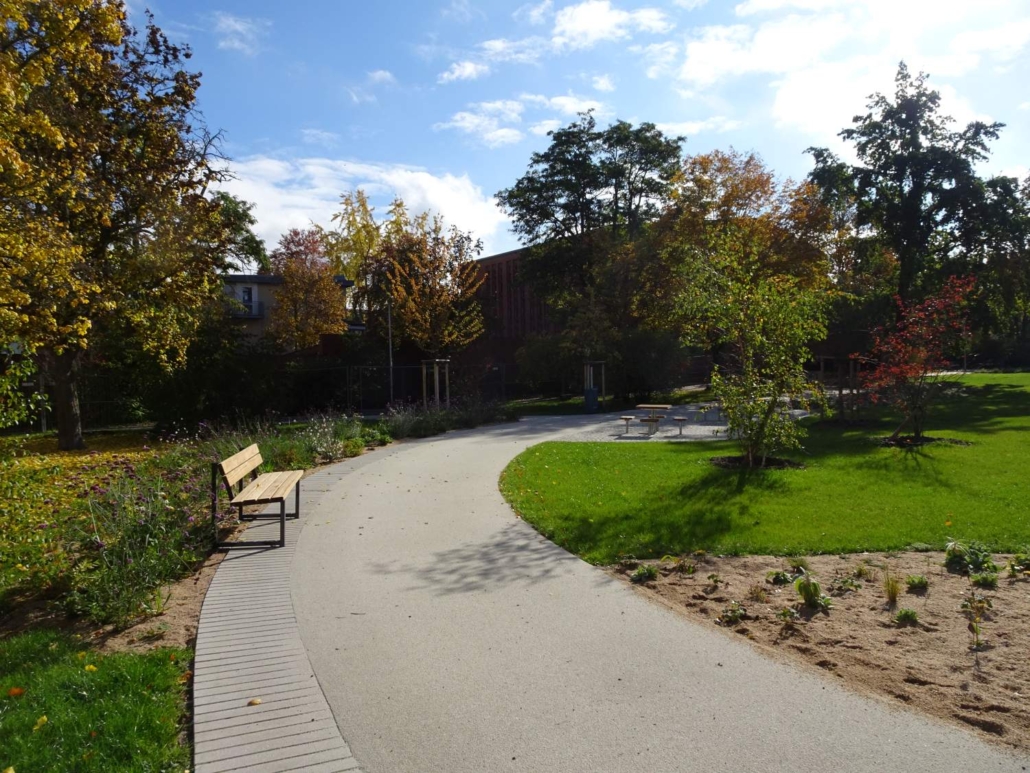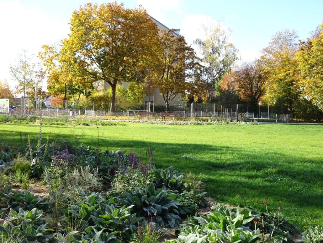 Die Neugestaltung behebt die offenkundigen Defizite der abgenutzten Parkfläche. Dem weitgehend intakten Baumbestand werden neue Vegetationsebenen hinzugefügt, die den Park als Innenraum erlebbar machen. Abstandsgrün und Gebüsche werden ausgelichtet, so dass die wahrnehmbaren Grenzen des Parkes sich weiten. Ein Ringweg umrahmt eine Rasenfläche als inszenierte freie Mitte, der von einem Blütenband begleitet wird und an den sich kleine Platzflächen mit generationsübergreifenden Spiel und Bewegungsgeräten anlagern.