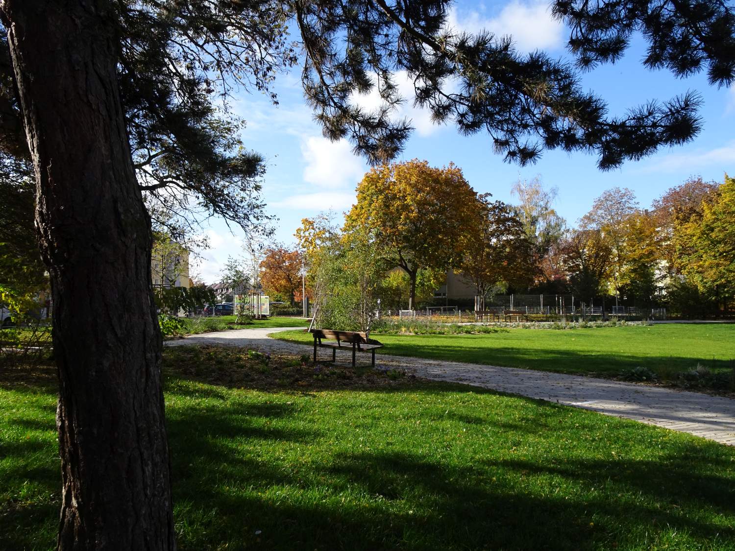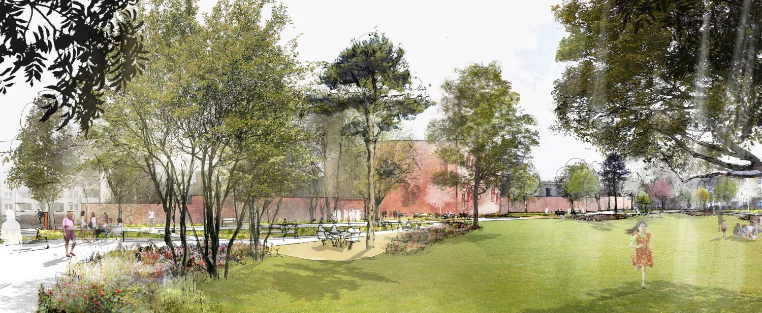 Die Neugestaltung behebt die offenkundigen Defizite der abgenutzten Parkfläche. Dem weitgehend intakten Baumbestand werden neue Vegetationsebenen hinzugefügt, die den Park als Innenraum erlebbar machen. Abstandsgrün und Gebüsche werden ausgelichtet, so dass die wahrnehmbaren Grenzen des Parkes sich weiten. Ein Ringweg umrahmt eine Rasenfläche als inszenierte freie Mitte, der von einem Blütenband begleitet wird und an den sich kleine Platzflächen mit generationsübergreifenden Spiel und Bewegungsgeräten anlagern.